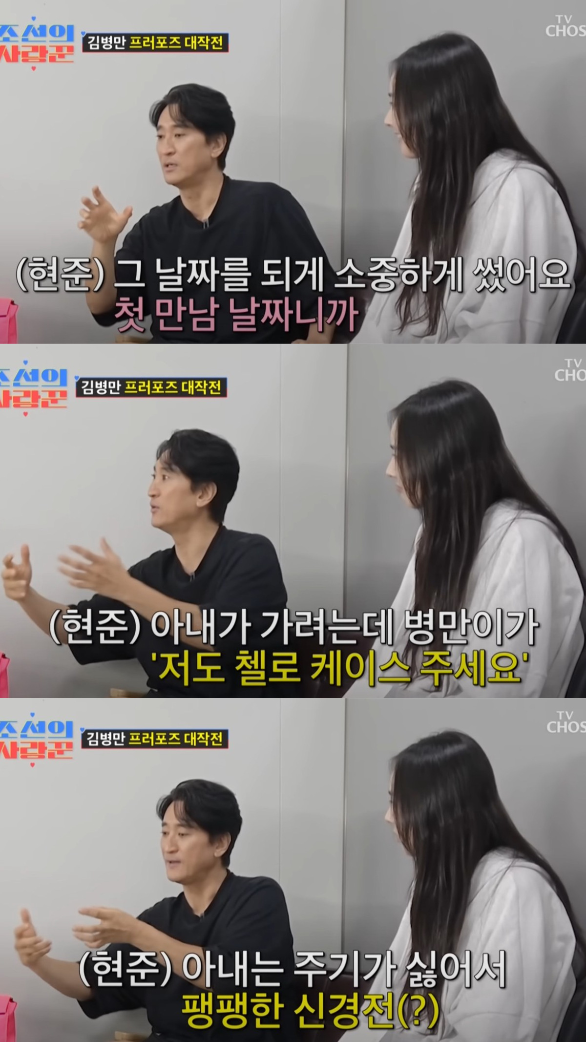 신현준과 아내의 만남. 유튜브 채널 'TVCHOSUN - TV조선' 영상 캡처 신현준은 “보통 사인에 날짜를 쓰는데 그 날짜를 굉장히 소중하게 썼다. 첫 만남의 날짜일 테니까”라고 다정하게 말했다. 이어 그는 “아내가 가려는데 병만이가 ‘저도 첼로 케이스 주세요’라고 했다. 그런데 아내는 주기가 싫어서 팽팽한 신경전을 벌였다”고 말해 웃음을 안겼다.