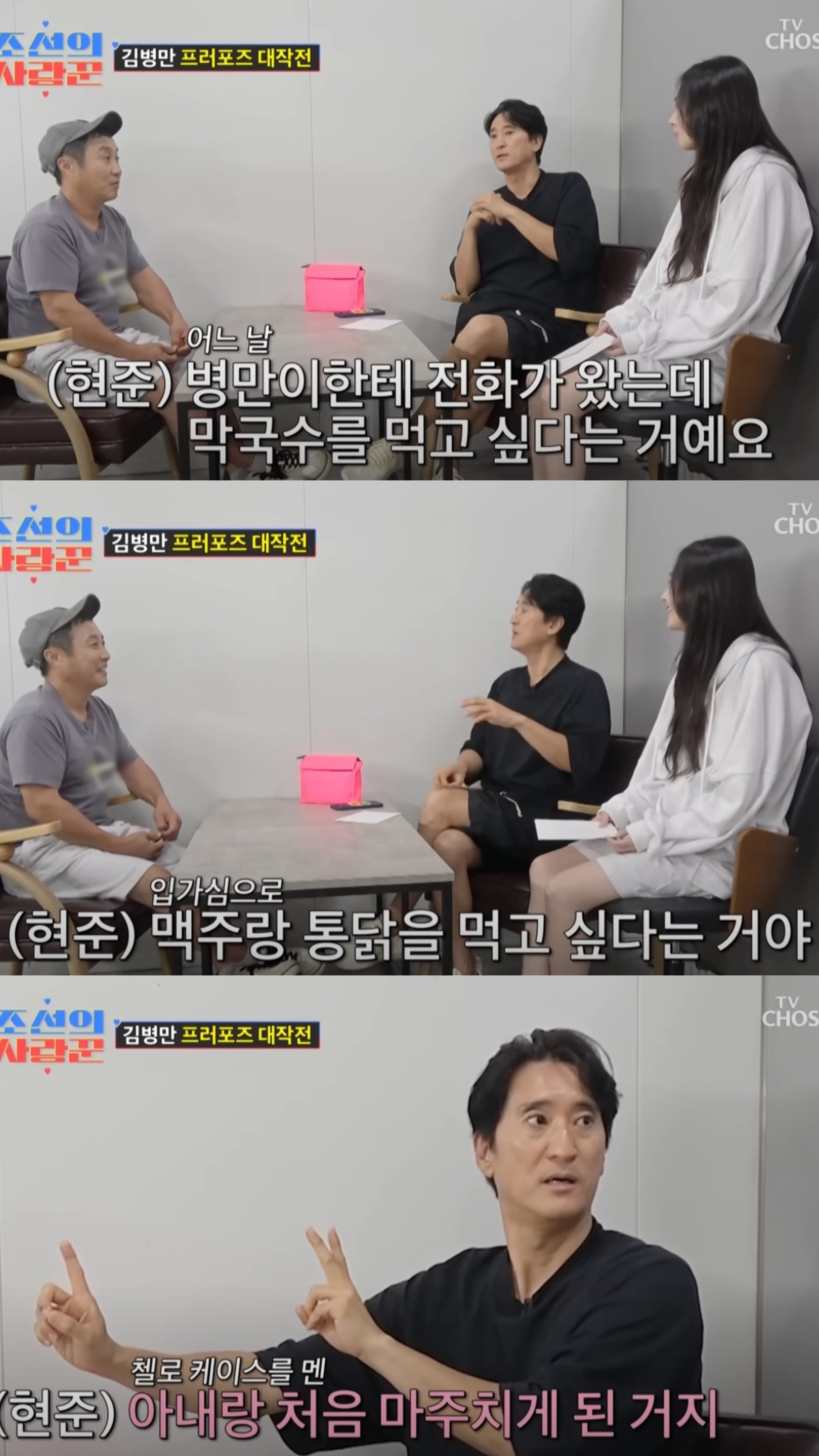 김병만 덕분에 지금의 아내와 처음 마주치게 된 신현준. 유튜브 채널 'TVCHOSUN - TV조선' 영상 캡처 신현준은 “‘정글의 법칙’ 촬영을 하고 나왔는데 병만이에게 전화가 왔다. 막국수를 먹고 싶다고 하더라”라며 당시를 회상했다. 두 사람은 함께 막국수를 먹고 가게를 나왔는데, 김병만이 갑작스레 맥주와 통닭이 먹고 싶다고 했다고 해서 통닭집으로 걸어갔다. 그런데 그때 신현준의 아내가 첼로 케이스를 들고 거리를 지나가고 있었다고 밝혔다.