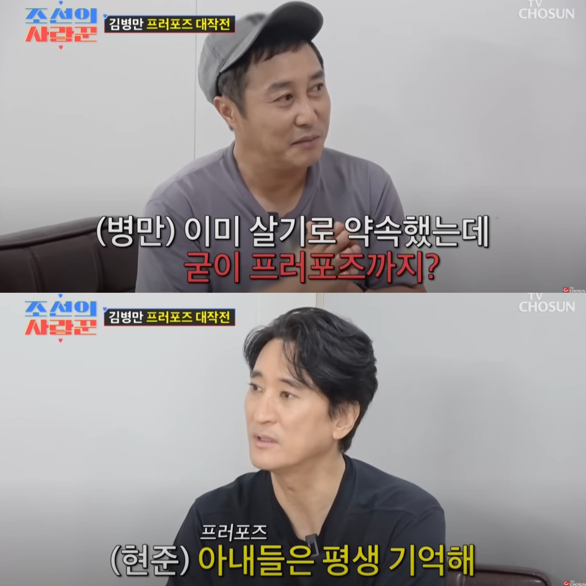 김병만의 프러포즈에 조언하는 신현준. 유튜브 채널 'TVCHOSUN - TV조선' 영상 캡처 “형이 친형 같아서 고민 상담을 많이 했었다”고 말하는 김병만에 신현준은 “그때 병만이가 밖에서 보면 행복해 보였는데 내가 봤을 때는 안 그랬다. 그런데 요즘은 굉장히 행복해 보인다”라고 재혼을 앞둔 김병만에게 응원의 말을 전했다. 김병만이 “아직 프러포즈를 못 했다. 이미 살기 시작했는데 프러포즈까지 해야 하냐”고 털어놓은 고민에 신현준은 “아내들은 끝까지 기억한다. 많이 비싼 거보다 진심이 느껴지면 좋다”고 진심 어린 조언을 건네기도 했다.