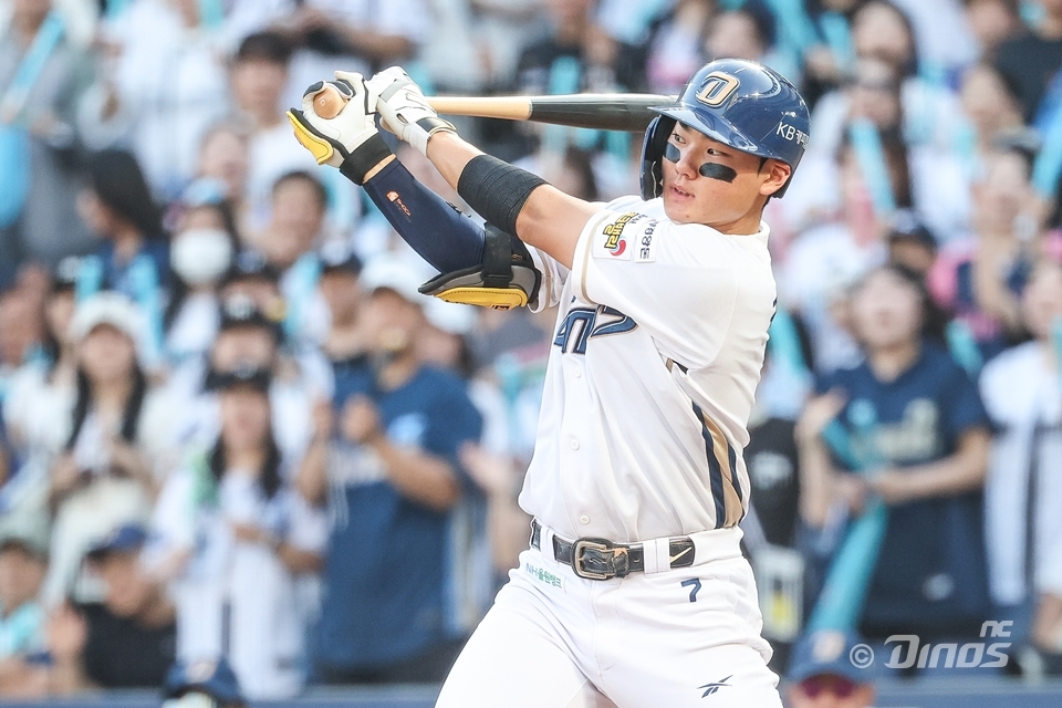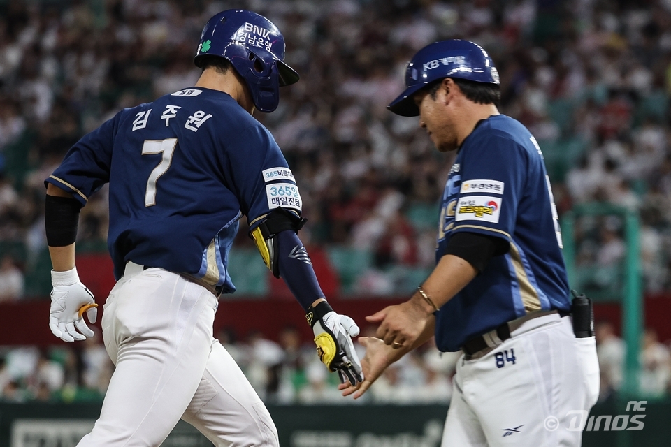 1번 타자 유격수로 나선 김주원은 1회 첫 타석에서 우익수 플라이, 2회 두 번째 타석에서 삼진으로 물러났다. 그러나 2-4로 뒤진 4회 2사 1,3루에서 적시 2루타를 때려내며 타격감을 예열시켰고, 5-4로 앞선 6회 달아나는 솔로포를 터뜨리며 장타본능을 뽐냈다. 8회 다섯 번째 타석에서도 안타를 때려낸 김주원은 5타수 3안타 2타점 2득점으로 리드 오프이자 해결사 노릇을 동시에 해냈다. 이날 경기를 포함한 김주원의 올 시즌 성적은 타율 0.301(465타수 140안타) 13홈런 53타점 89득점 38도루. OPS는 0.850. 규정타석을 채운 유격수 중 유일한 3할 타자이자 OPS 1위, 홈런 1위, 도루 1위다. 이미 골든글러브 유격수 부문 수상자 명단에 ‘김주워’까지 쓴 것이나 다름없다. 마지막 자음 ‘ㄴ’만 써넣으면 되는 상황이다.