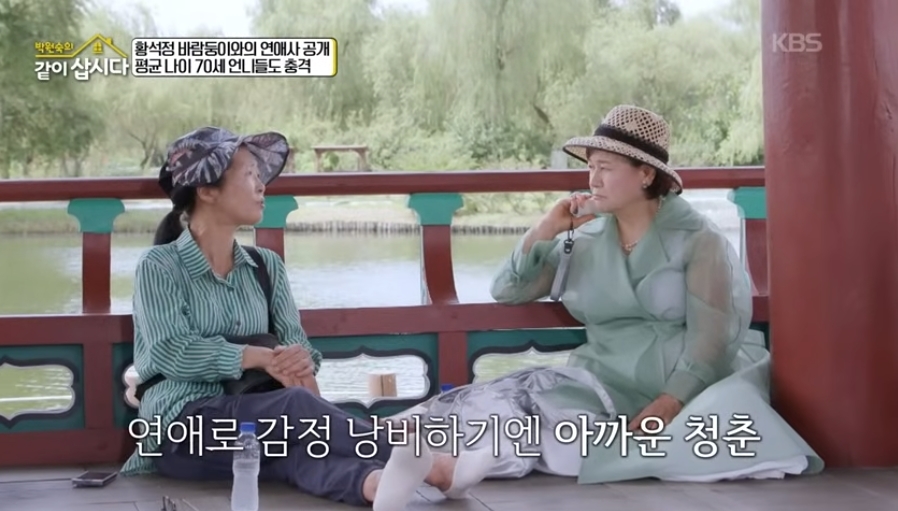 KBS2 ‘박원숙의 같이 삽시다’ 방송 화면 캡처 황석정은 또 “난 20대 때보다 지금이 더 행복하다. 20대가 제일 힘들었다. 뭘 해야 될지도 모르겠고 정신이 하나도 없었다. 몸은 뜨거워서 밤마다 몸 식히려고 밖으로 나가서 뛰었다”고 과거를 되돌아봤다. 27살에 첫 연애를 했다는 황석정은 “제 연애사는 정말 진흙탕이었다. 다들 제 이야기를 들으면 기분 나빠하더라”면서 고백을 이어갔다.