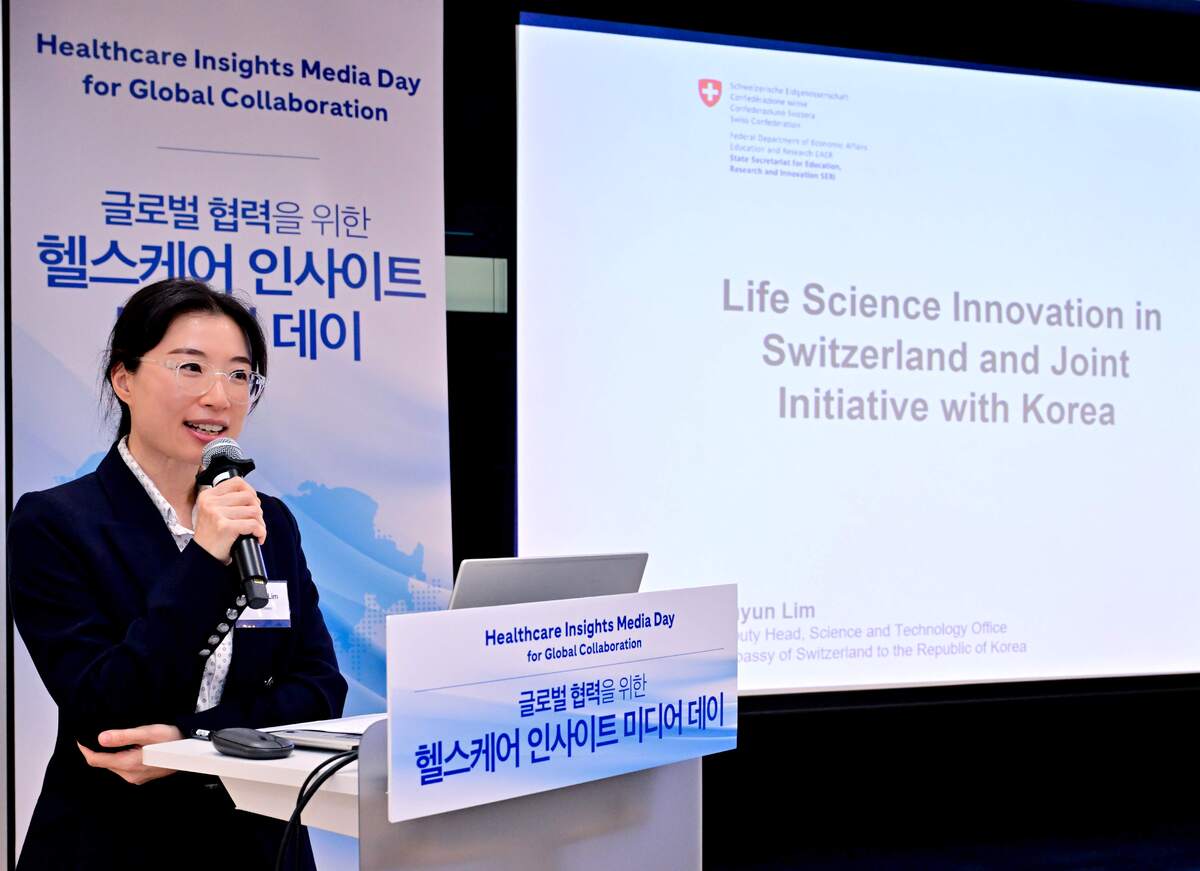 임지현 주한 스위스 대사관 과학기술협력실 부실장이 16일 서울에서 열린 ‘헬스케어 인사이트 미디어데이’에서 ‘스위스 생명과학 혁신과 한국과의 공동 이니셔티브’를 주제로 발표하고 있다. 임지현 부실장은 주제 발표에서 “스위스는 바이오제약과 생명과학 분야의 글로벌 리더”라며 “한국은 우수한 연구인력과 기술 수용성 덕분에 스위스의 이상적인 협력 파트너”라고 말했다. 함얀 보겔드 로슈 아시아 파트너링 헤드는 “스타트업이 과학적 근거와 데이터로 기술을 입증할 수 있는 환경이 중요하다”며 “그런 생태계가 만들어질 때 글로벌 제약사가 적극적으로 협력하게 된다”고 설명했다.