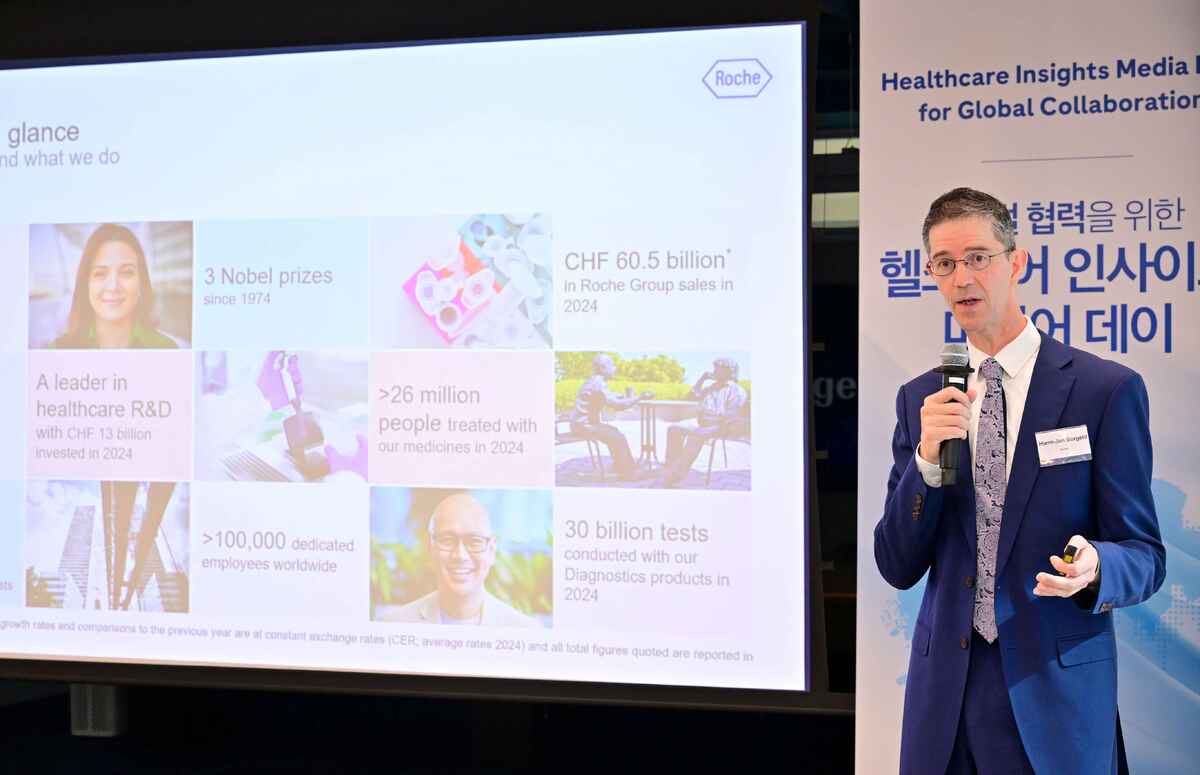 함얀 보겔드 로슈 아시아 파트너링 헤드가 16일 서울에서 열린 ‘헬스케어 인사이트 미디어데이’에서 로슈의 글로벌 연구개발 현황과 혁신 파트너십 전략을 소개하고 있다. 2024년 기준 로슈의 글로벌 매출은 약 640억 달러(한화 약 88조 원)로, 존슨앤존슨(약 94조 원), 화이자(약 74조 원)에 이어 상위권을 형성하고 있다. 국내 대표 바이오기업인 셀트리온의 2024년 매출(약 3조5000억 원)과 비교하면 약 25배 규모다. 글로벌 제약사와 국내 기업 간의 격차가 여전히 크지만, 로슈는 “한국의 연구 역량은 세계 어느 나라와 비교해도 손색없다”며 협력 가능성을 높이 평가했다.