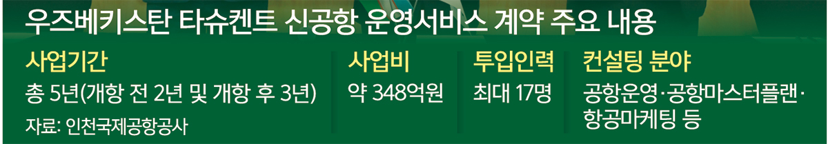 인천공항공사는 타슈켄트 신공항의 운영전반에 대해 컨설팅을 제공해 신공항의 성공적인 개항 및 운영을 지원하는 책임을 맡았다. 앞으로 5년간 공항 건설 및 운영 전반에 컨설팅을 제공한다. 이번 운영 서비스 계약은 약 348억원 규모이며 이를 통해 안정적인 해외사업 수익을 확보했다고 공사는 설명했다.