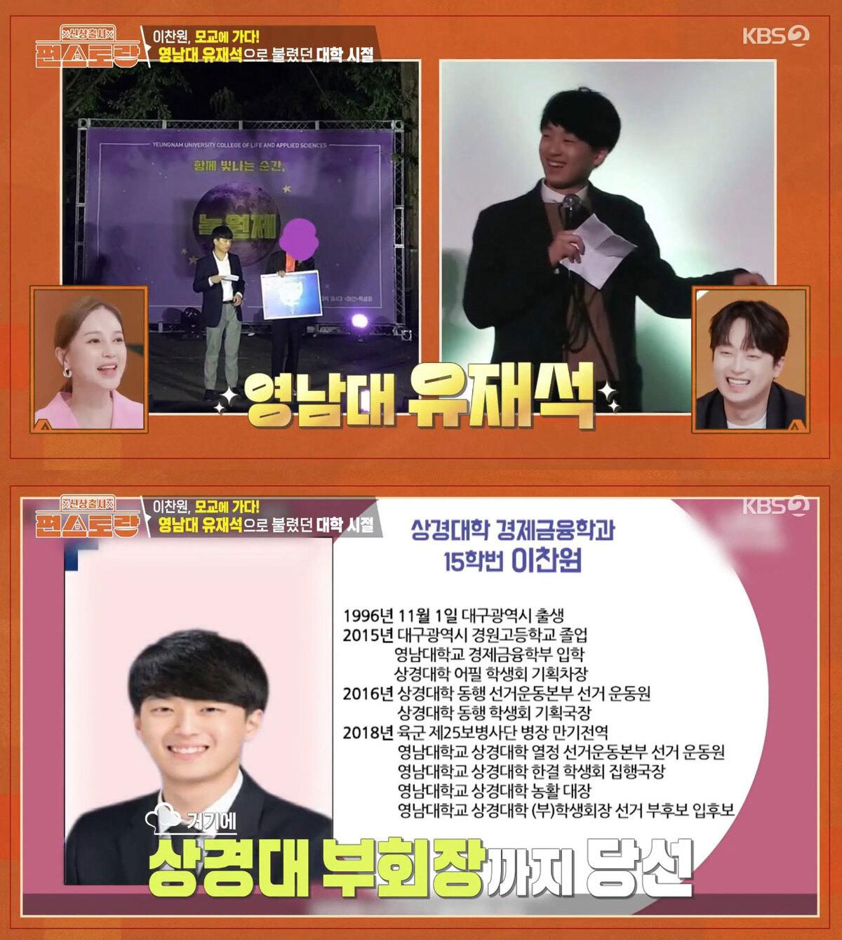 이날 이찬원은 “데뷔하고 처음 오는 것 같다”며 감회에 젖었다. 대학 시절 축제 때마다 노래와 진행을 맡았던 그는 ‘영남대의 유재석’으로 불렸고, 당시 사진이 공개되자 “저런 사진은 도대체 어디서 구하는 건가”라며 웃음을 보였다.