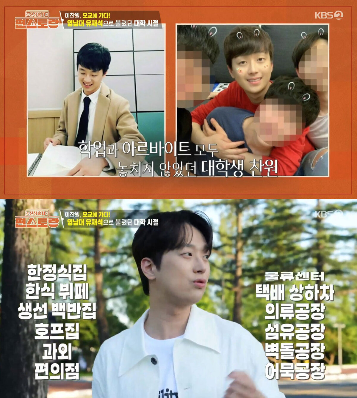 KBS2 ‘신상출시 편스토랑’ 방송 화면 캡처 그는 학생회 활동과 농활 대장 등 다양한 대외활동을 병행했고, 상경대학 부회장까지 역임했다. 이찬원의 활발한 대학 시절 이력에 이연복 셰프는 “찬원이 진짜 열심히 살았다”며 기특해했다. 또 이찬원은 “아르바이트를 진짜 많이 했다”며 편의점, 과외, 호프집, 생선 백반집, 한식 뷔페, 한정식집, 어묵공장, 벽돌공장, 섬유공장, 의류공장, 택배 상하차, 물류센터 등에서 일한 경험을 언급했다. 그는 부모님께 손을 벌리지 않기 위해 아르바이트만 20개 이상 했다고 덧붙였다.