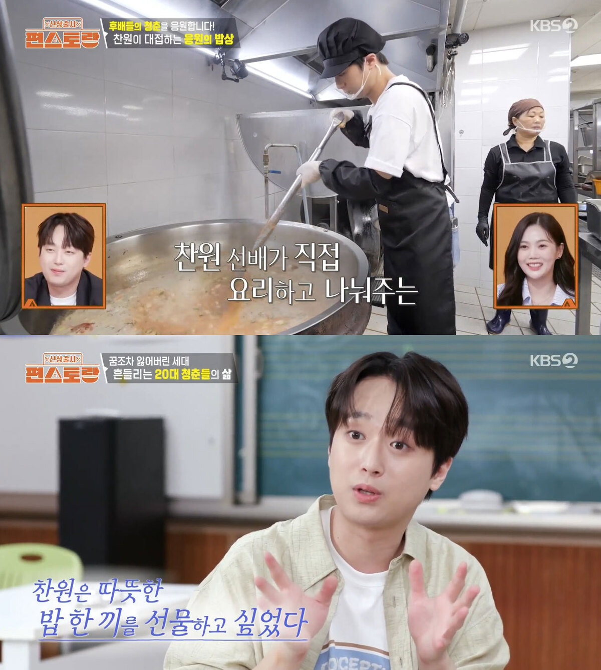 배식 시간, 식당 앞에는 긴 줄이 늘어섰다. 이찬원은 배식대에 서서 직접 밥을 담으며 후배 한 명 한 명에게 인사를 건넸다. 돼지고기를 먹지 못하는 유학생에게 즉석에서 계란말이를 만들어주고, 식성이 좋은 미식축구부 후배들에게는 산채비빔밥을 추가로 내주는 등 세심함을 보였다. 또 학생회 후배들에게는 “힘들 텐데 응원하겠다”고 말하며, 회식비로 쓰라고 용돈을 쾌척해 ‘성공한 선배’의 면모를 드러냈다.
