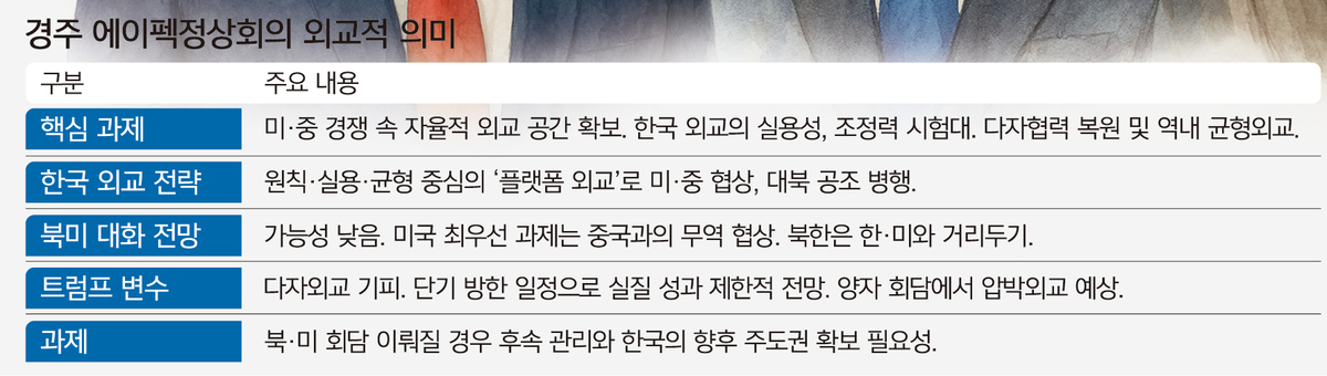다자회의인 에이펙의 본질에 집중하며 이를 활용할 기회를 보는 것이 한국으로서는 중요한 전략이라는 지적도 있다. 이상현 세종연구소 수석연구위원은 “트럼프 대통령의 짧은 방한 일정은 에이펙보다 자신 중심의 메시지 발신을 위한 것으로 해석되고, 한·미 회담이 열려도 실질 협력보다 한국을 압박할 수단이 될 가능성이 높다”고 진단했다. 무엇보다 관세·투자 문제라는 핵심 갈등 요인이 남아있다. 한국은 에이펙 주최국으로서 ‘역내 다자협력’에 충실한 모습을 보이는 것이 바람직하다는 제언이다. 트럼프 대통령에 대해서는 ‘에이펙 본회의 불참’보다 한국을 고려해 방한을 결정했다는 점에 외교적 의미를 둬야 한다는 분석이 나온다. 반 교수는 “트럼프 대통령이 다자무대를 기피하는데도 한국에 오는 것 자체가 의미가 있고, 이를 어떻게 실익으로 연결하느냐가 문제”라며 “정상들이 내는 공동선언 메시지에 어떻게든 참여하게 하는 것이 관건”이라고 말했다. 한·미 정상회담을 통해 경주선언에 대한 트럼프 대통령의 간접적인 동조를 유도해야 한다는 것이다.
