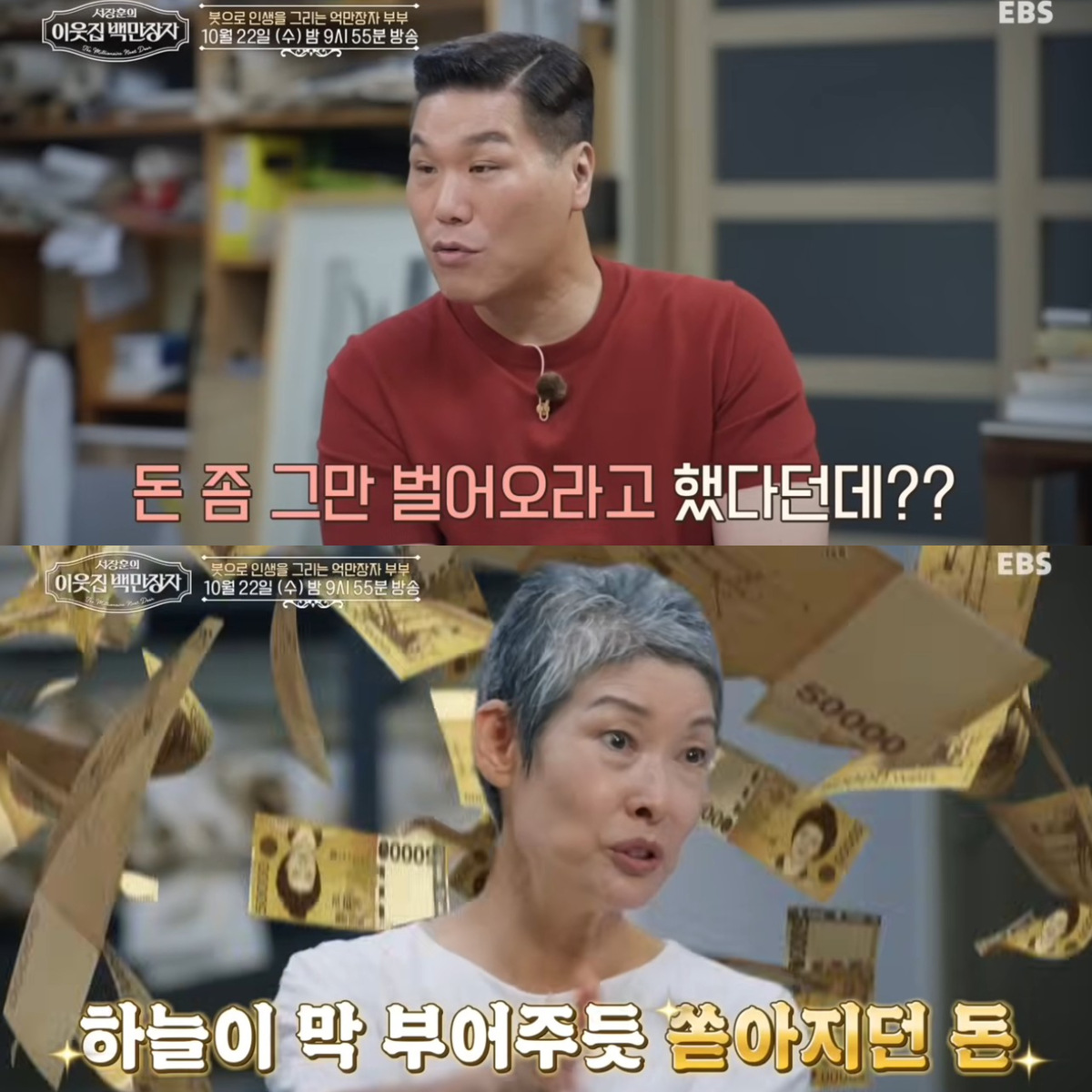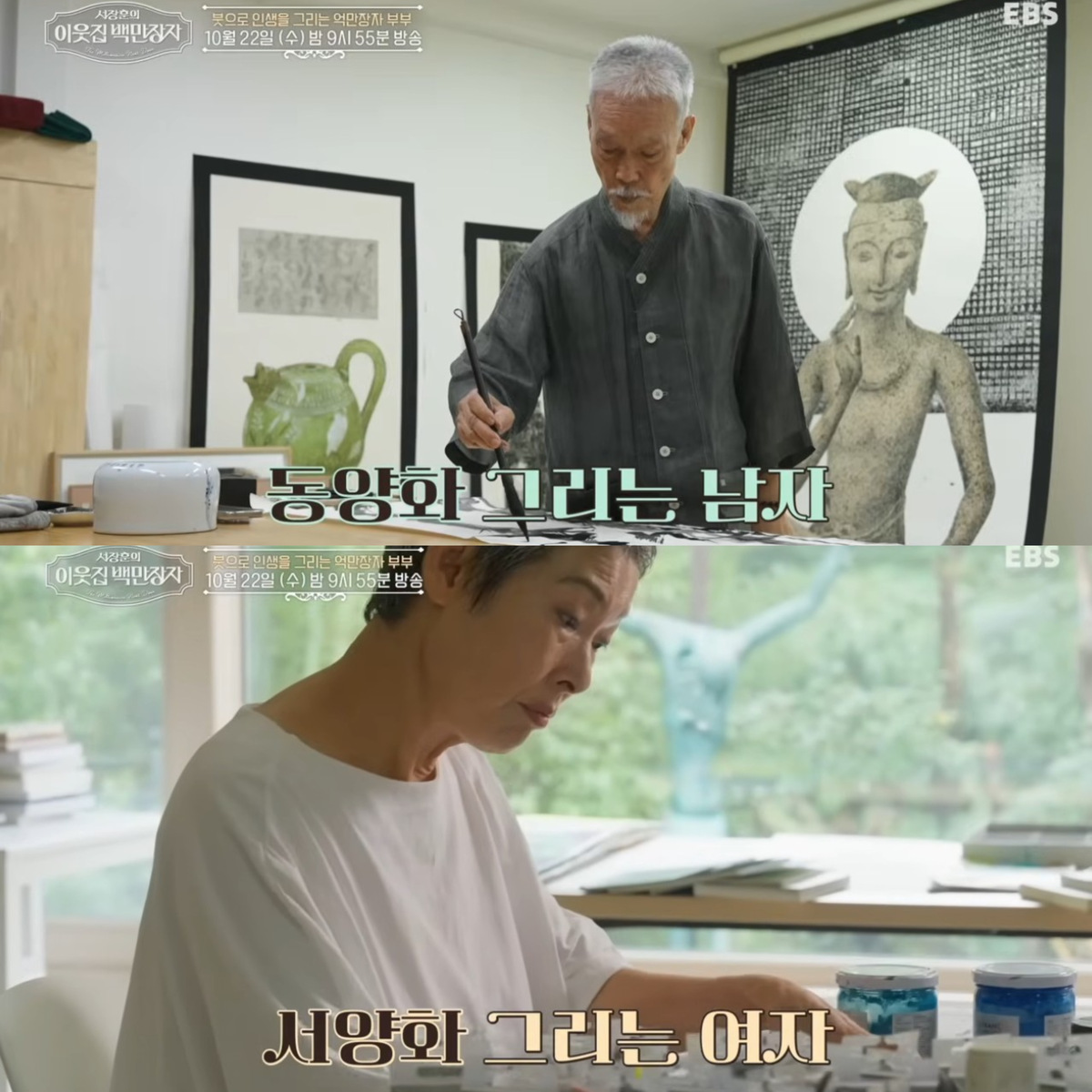 '예술계 억만장자'로 불리는 박대성·정미연 부부의 인생관. 유튜브 채널 'EBS 다큐' 영상 캡처 ‘부부 화백’ 박대성·정미연이 “하늘이 부어주듯 돈이 쏟아졌다”며 ‘예술계 억만장자’의 면모를 입증했다. 22일 방송되는 EBS ‘서장훈의 이웃집 백만장자’에서는 지난주 뜨거운 화제를 모은 ‘한국 수묵화의 거장’ 박대성과 ‘성화의 거장’ 정미연 부부의 또 다른 이야기가 공개된다.