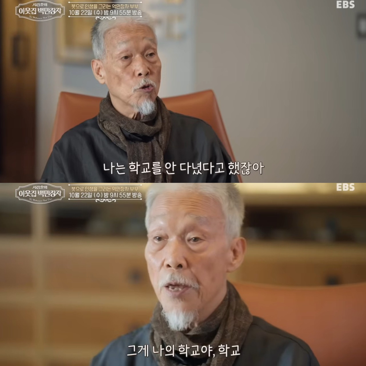 "학교를 다니지 않았지만, 그것이 곧 학교였다"고 말하는 박대성. 유튜브 채널 'EBS 다큐' 영상 캡처 한편, 이날 방송에서는 MC 서장훈과 장예원이 생애 최초 크로키 모델로 깜짝 변신해 눈길을 끌었다. 장예원이 먼저 모델로 나서자 서장훈은 “실물보다 낫다”며 장난스럽게 말했지만, 막상 본인 차례가 되자 긴장감에 딱딱하게 굳은 분위기를 풍겼다.