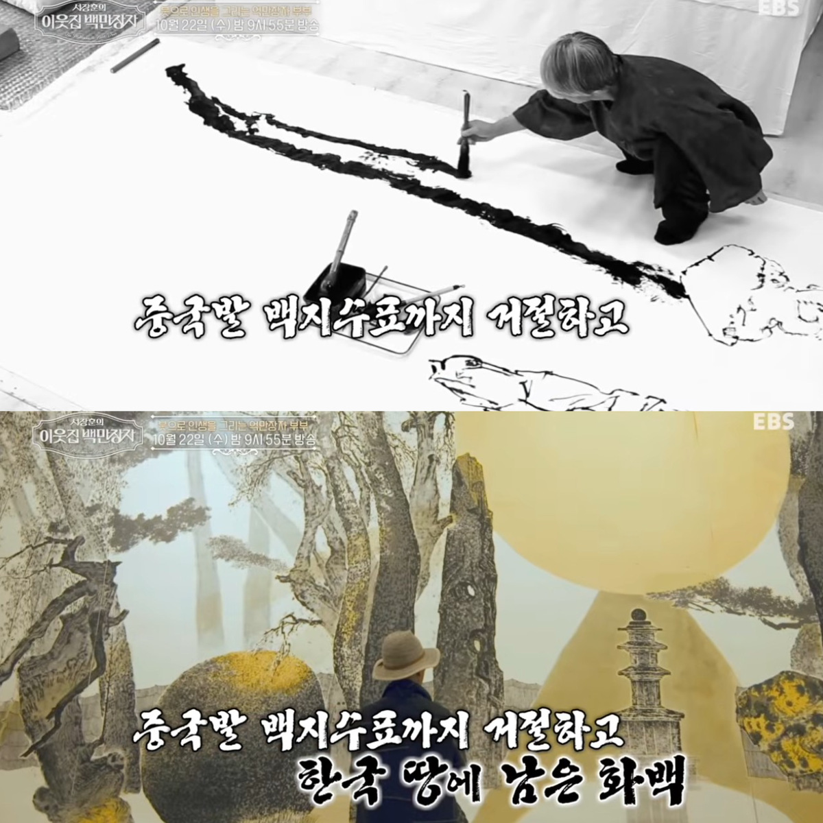 오히려 중국발 '백지수표'를 거절할 만큼 물욕이 크지 않았던 박대성. 유튜브 채널 'EBS 다큐' 영상 캡처 이날 방송에서는 박대성이 중국발 ‘백지수표 제안’을 단칼에 거절한 충격적인 사연이 공개되기도 했다. 중국에서 전시회를 열었을 당시 공산당 고위 간부들이 그를 찾아와 귀화를 목적으로 어마어마한 액수를 제시했다. 하지만 박대성은 한 치의 망설임도 없이 거절을 택했다고 고백했다.