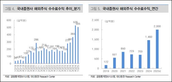 증권사의 브로커리지 수수료수익 중 해외주식 수수료수익이 차지하는 비중도 꾸준히 늘었다. 지난해 4분기부터 올해 1분기까지 연속 5000억원을 넘겼다. 키움증권, 한국투자증권, NH투자증권, 미래에셋증권 , 삼성증권 등 대형 증권사 5곳의 전체 브로커리지 수수료 중 해외 수수료 비중은 40.2%까지 올랐다. 이에 따라 해외 수수료 수익 규모도 급증했다. 지난해 1조4600억원 규모였지만 올해는 연간 2조원을 돌파할 것으로 전망된다.