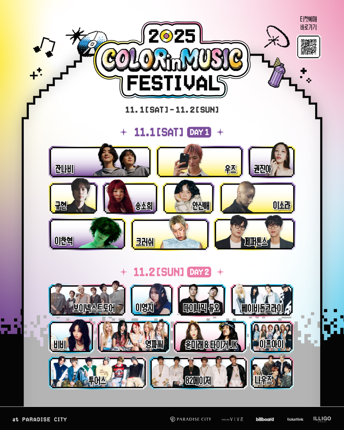 파라다이스시티는 오는 11월 1~2일 양일간 빌보드코리아, 필링바이브와 함께 복합형 음악 축제 ‘2025 컬러 인 뮤직 페스티벌(2025 Color in Music Festival)’을 개최한다고 31일 밝혔다. 이번 페스티벌은 K-컬처를 이끄는 음악과 패션을 리조트 내 야외 잔디광장 ‘컬처파크’에서 즐길 수 있는 새로운 형태의 ‘뮤캉스 페스티벌’이다. 페스티벌에는 규현, 권진아, 나우즈, 다이나믹 듀오, 보이넥스트도어, 비비, 베이비돈크라이, 송소희, 안신애, 영파씨, 우즈, 윤미래, 이소라, 이영지, 이찬혁, 이프아이, 잔나비, 크러쉬, 타이거 JK, 투어스, 페퍼톤스, 82메이저가 출연해 발라드·록·인디·국악·힙합 등 장르를 불문하고 풍성한 음악 경험을 선사할 예정이다.
