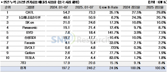 LG에너지솔루션은 전년 동기 대비 6.2%(50.9GWh) 성장하며 시장 점유율 207%로 2위를 유지했다. SK온은17.3%(24.6GWh)의 성장률을 기록해 3위(10.0%)에 올랐다.