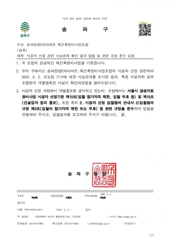 이날 송파구는 조합 측에 '서울시 공공지원 정비사업 시공자 선정기준 제 10조(입찰 참가 자격 제한, 입찰 무효 등), 15조(건설업자 등의 홍보) 등 관련 규정을 준수해 입찰을 진행해달라'는 내용의 공문을 보냈다. 10조에서는 대의원회의 의결을 거쳐 금품, 향응 등 재산상 이익을 제공해 입찰 또는 선정이 무효 된 자에 대해 입찰 참가 자격을 제한할 수 있다고 규정하고 있다. 15조에서 개별 홍보를 금지하고, 홍보를 목적으로 사은품·금품·재산상 이익을 제공해서는 안 된다고 명시돼있다.