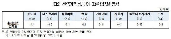 박경원 대한상의 SGI 연구위원은 "전력가격 상승이 산업별 생산활동에 미치는 영향은 업종별 투입구조 차이로 인해 다르다"며 "제조원가에서 전력비의 비중이 높고 다른 에너지원으로의 대체가 어려운 반도체·디스플레이 등 전력집약산업은 생산비 부담이 급격히 커져 생산 위축으로 이어질 가능성이 있다"고 설명했다.