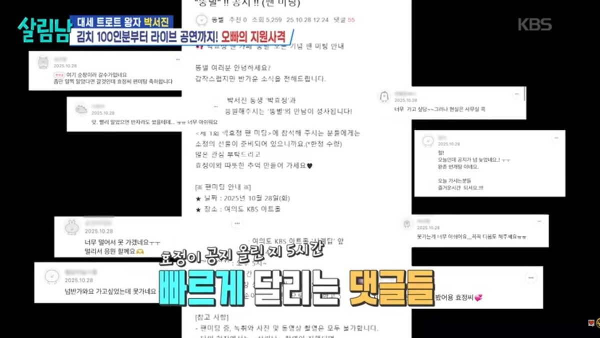 효정의 팬미팅 공지에 빠르게 달리는 댓글. 유튜브 채널 'KBS Entertain' 영상 캡처 박서진의 팬미팅 현장에서도 그는 무대에서 동생의 팬카페를 직접 홍보했고, 팬미팅을 앞두고 거리로 나선 동생과 함께 팬미팅 참석을 권유하기도 했다. 포스터 준비와 무대 세팅도 끝낸 박서진은 축하무대까지 완벽히 소화하며 든든한 지원군으로 활약했다. 박서진의 도움에 힘입어 동생 효정의 첫 팬미팅도 성공적으로 마무리됐다. 한 명도 오지 않을 것이라 예상한 것과는 달리, 효정은 팬미팅 당일 안대를 쓰고 무대에 올랐다가 안대를 벗는 순간 10명의 팬들이 자리한 것을 보고 놀라움을 감추지 못했다.